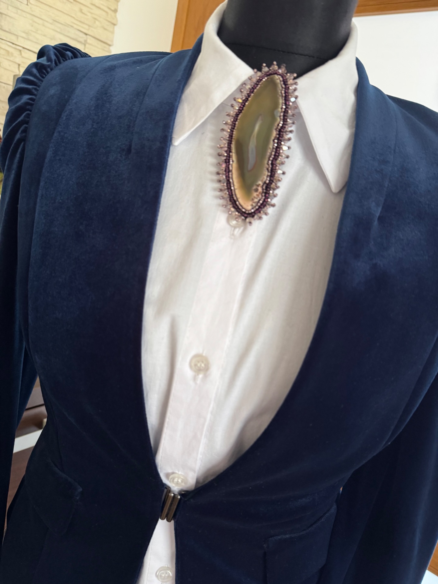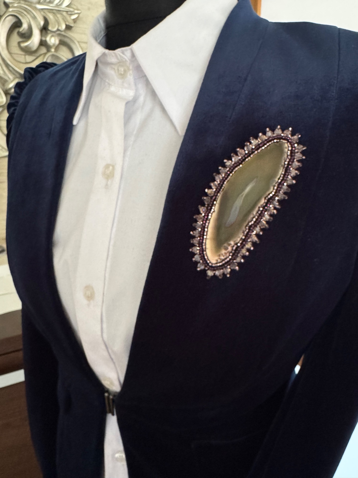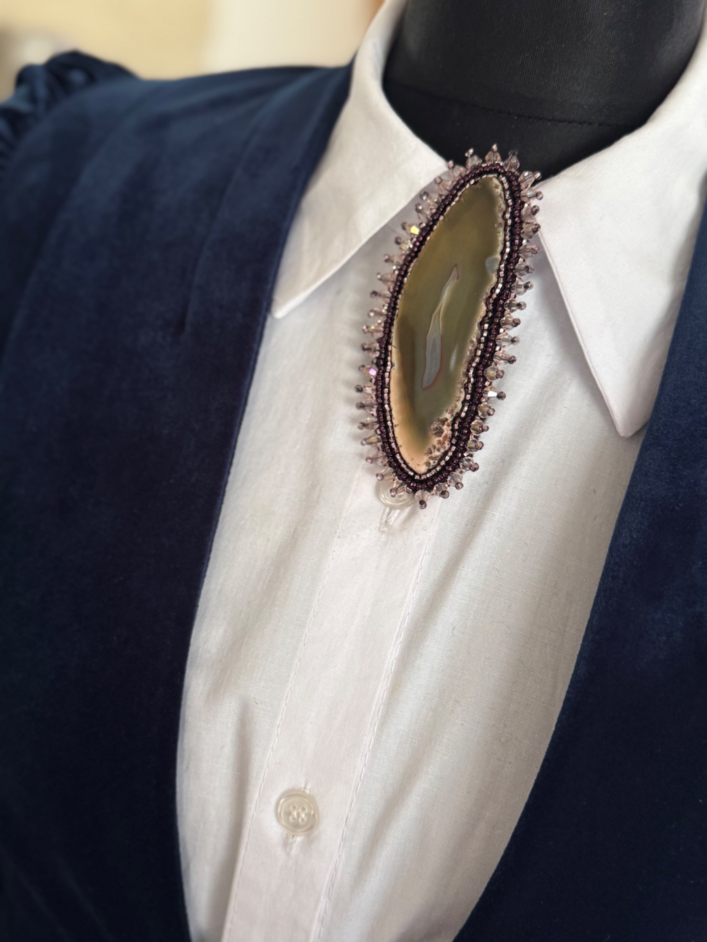 Ručne šitá brošňa ACHÁT s upínaním na magnet. Rozmer 4x10 cm