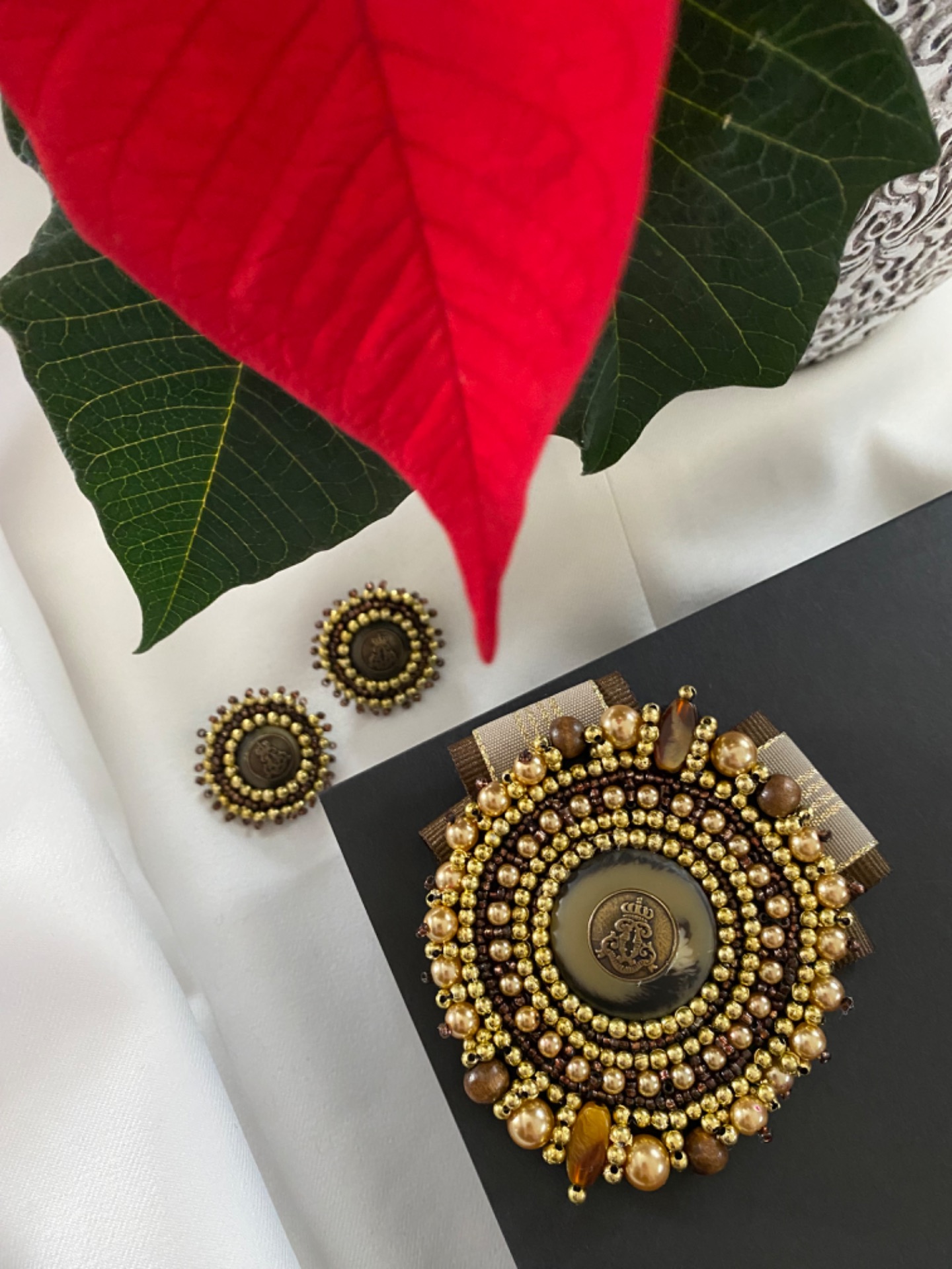 SET- Ručne šitá brošnička so stuhou (rozmer 7x9cm) a náušničky ( 3,5cm)